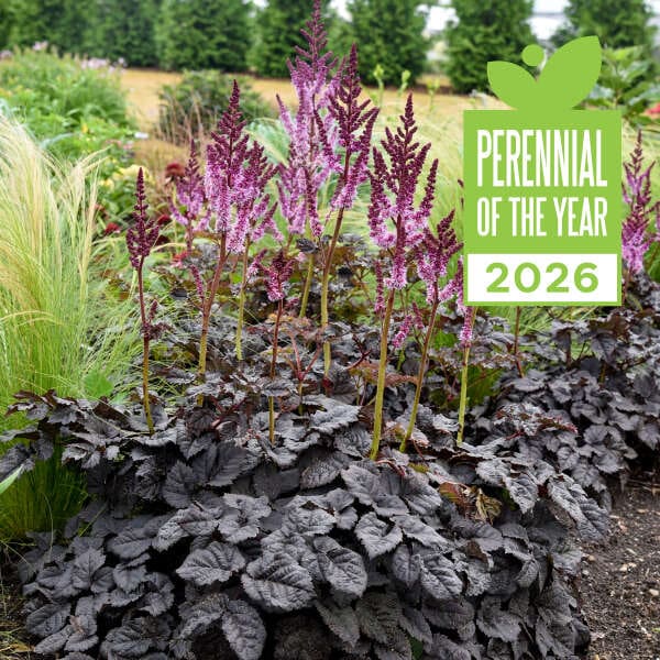 An instant classic for the landscape! ‘Dark Side of the Moon’ is the only dark leafed Astilbe with purple flowers that’s on the market. Rich deep chocolate burgundy leaves form an incredibly attractive mound of foliage. Emerging leaves are yellow with a dark margin with a glossy sheen that become completely dark as they age. Dark stems hold raspberry buds that burst forth with rosy purple flowers. This performs best both for growing and flowering in full sun in the north with adequate moisture, but also grows in shade.
