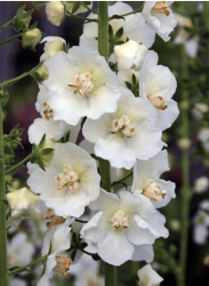 Hardy, drought-tolerant biennial or short-lived perennial, reaching 3–4 ft tall related to Mullein. Spires of white flowers and pale-yellow centers, blooming from June through the summer.